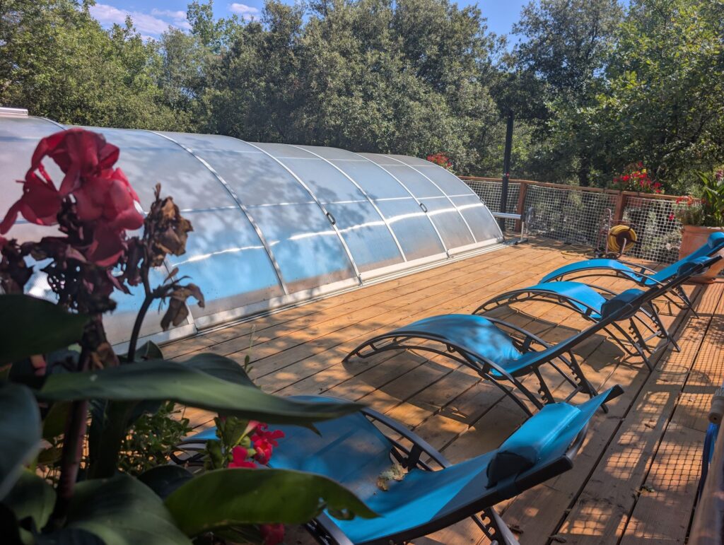 Dans ce grand espace, vous trouverez une grande plage de piscine traversée par 4 grands chênes blancs, 4 chaises longues pour vous relaxer et des fleurs partout: un paradis aquatique vous attend jusqu’au 30 octobre.